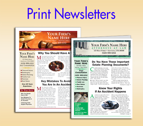 We offer a wide variety of marketing tools to keep you in touch, including firm brochures, email and print client newsletters, direct mail postcards, and giveaways like magnets and calendar cards. All of these items tell people about your services and generate interest in them, all in an easy, professional and cost-effective way.